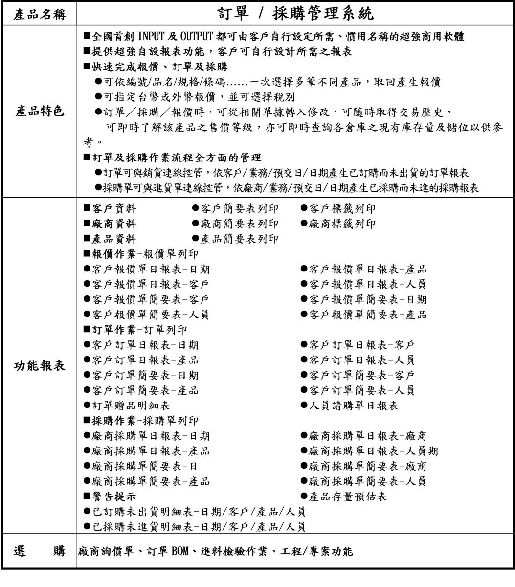產品特色 n全國首創INPUT及OUTPUT都可由客戶自行設定所需、慣用名稱的超強商用軟體 n提供超強自設報表功能,客戶可自行設計所需之報表 n快速完成報價、訂單及採購 l可依編號/品名/規格/條碼……一次選擇多筆不同產品,取回產生報價 l可指定台幣或外幣報價,並可選擇稅別 l訂單/採購/報價時,可從相關單據轉入修改,可隨時取得交易歷史,可即時了解該產品之售價等級,亦可即時查詢各倉庫之現有庫存量及儲位以供參考 n訂單及採購作業流程全方面的管理 l訂單可與銷貨連線控管,依客戶/業務/預交日/日期產生已訂購而未出貨的訂單報表 l採購單可與進貨單連線控管,依廠商/業務/預交日/日期產生已採購而未進的採購報表